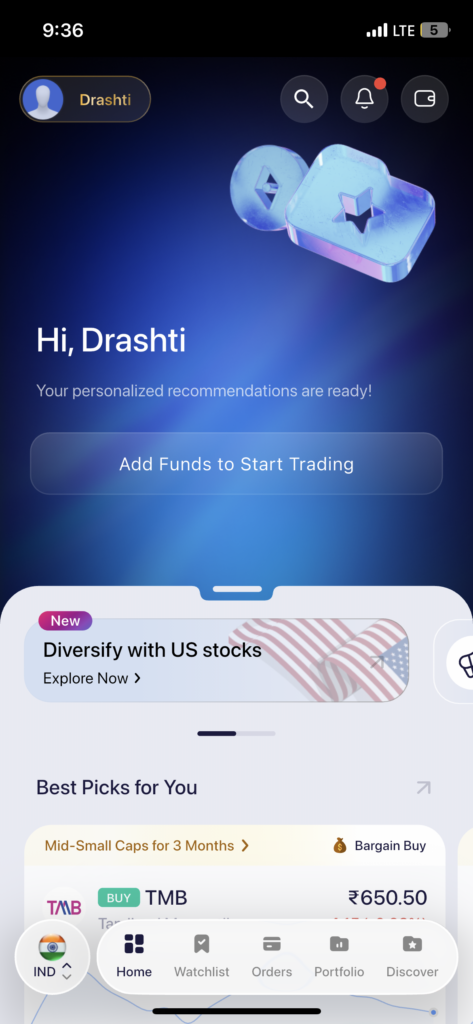 You can search for stocks listed on both NSE and BSE from the same search bar. If you already have stocks added to your Watchlist, you can also find them directly under the Watchlist tab without needing to search again