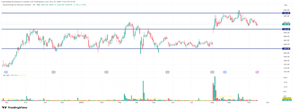 Hindustan Zinc presents an attractive technical setup as a Diwali pick, offering a potential upside toward the ₹700–₹720 zone. The stock recently underwent a correction followed by a robust multi-year breakout and has now established a solid base near the ₹400–₹410 range, a key confluence area of the previous swing low and the 200-week moving average. This zone has reaffirmed strong support at lower levels. Moreover, the price has reclaimed and sustained above its 20-week EMA, indicating a resurgence of bullish momentum and the possibility of a fresh impulse wave unfolding. We recommend Buy at ₹ 505 – ₹ 515 with a target of ₹700 and stop-loss at ₹ 400 for a 3-month view.