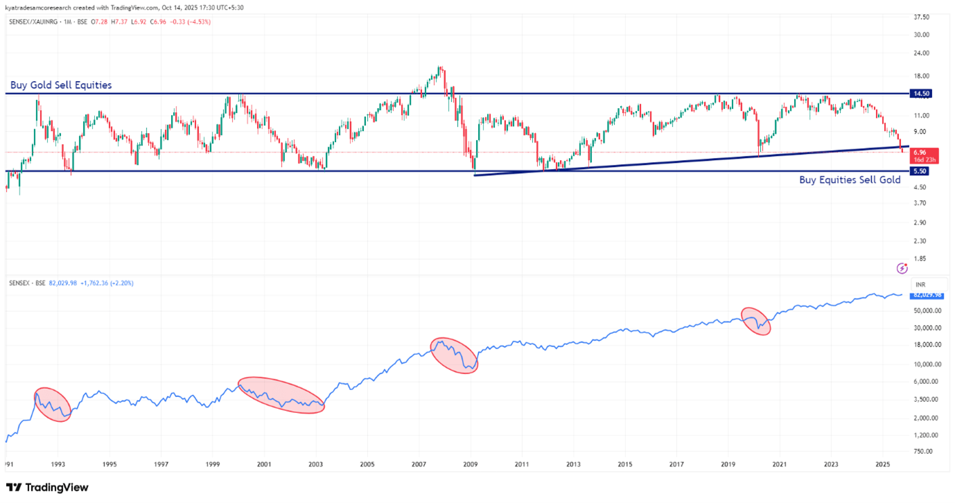 While major bottoms in equities (1991, 2001, 2009, 2011, 2020) coincided with sharp falls close to 5.5 in this ratio. Those panic phases were followed by massive equity upcycles as risk appetite revived and gold’s relative appeal faded.