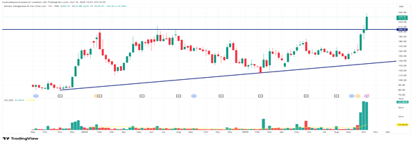 Technically, the stock remains in a strong uptrend, forming higher highs and higher lows after breaking out of a saucer pattern. Key support lies near ₹1,850–₹1,870, with bullish signals from RSI and MACD supported by rising volumes. We recommend to buy at ₹1,950–₹2,000 with a target of ₹2,400 and stop-loss at ₹1,780 for a 3-month view.