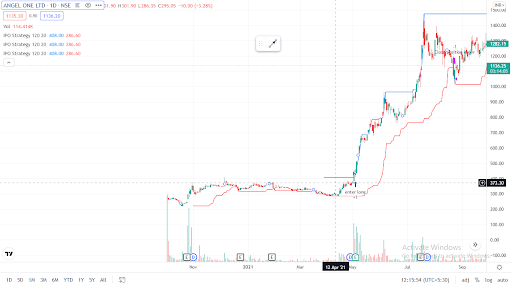 To find it we will apply the IPO breakout indicator on the chart which will highlight the 120 days high and let you know the entry price. It will also highlight when should you exit the stock by tracking the trailing stop loss of last 20 days.