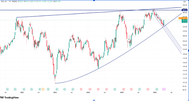 - A powerful rising trendline from the 2023 low of ~$103 has held every major correction for three years. Tesla's long-term uptrend structure is intact, and the stock just bounced decisively off this trendline this week — rallying +12.32%.